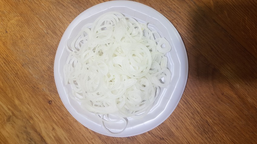לחתוך בצל לטבעות ולטגן במעט שמן.